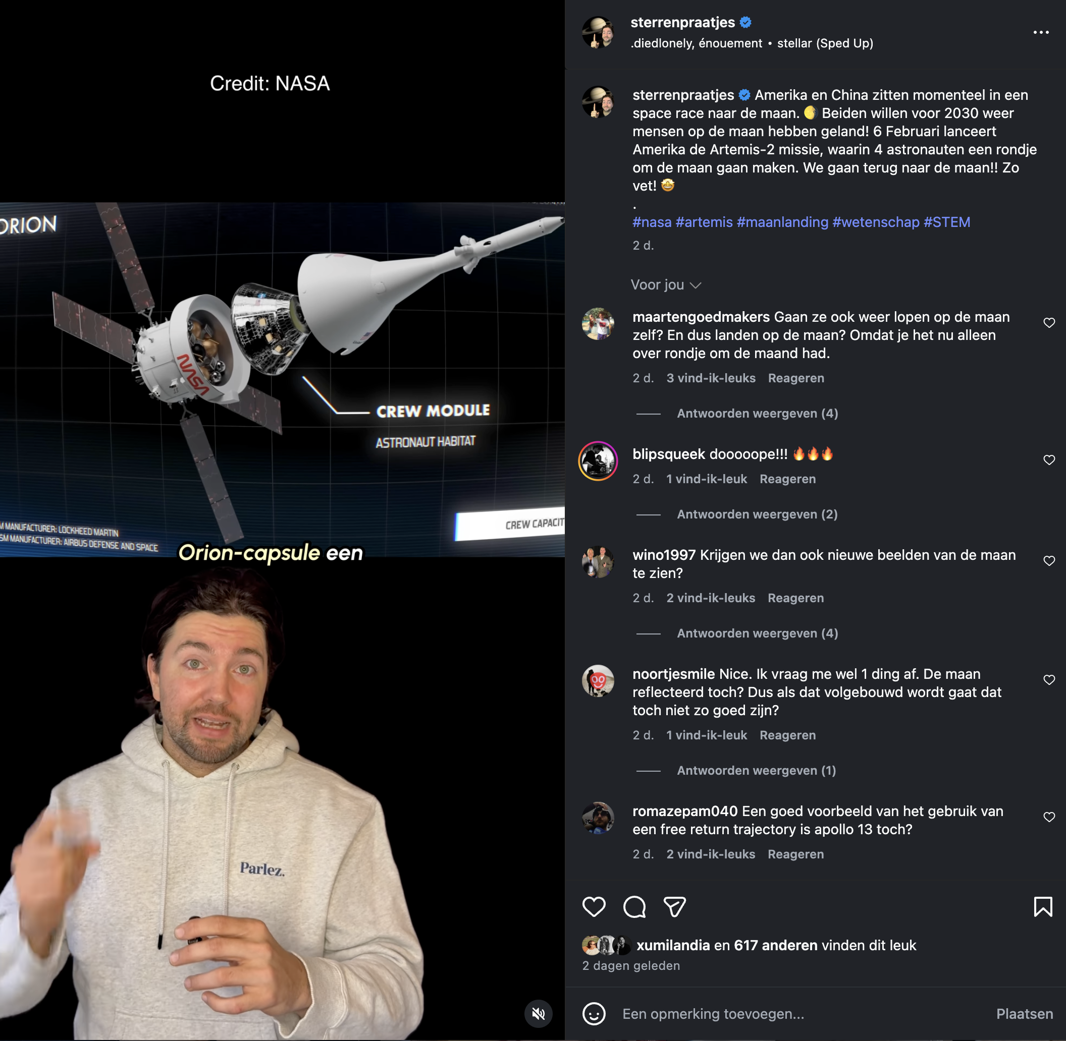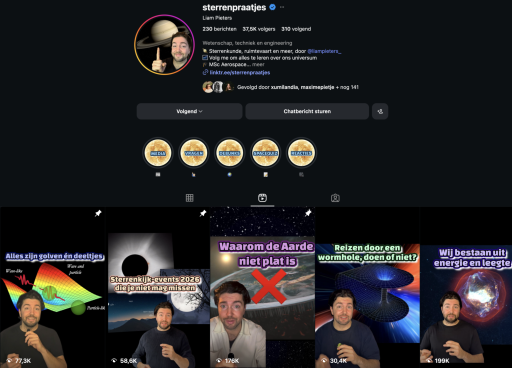 Neem een kijkje op de Sterrenpraatjes Instagram en TikTok! Hier plaats ik al mijn filmpjes over het universum. Af en toe diepgaande uitlegfilmpjes over Einstein’s relativiteitstheorie of de werking van quantummechanica, af en toe conspiracy debunk videos. Mijn grootste doel is om heel Nederland vaker omhoog te laten kijken! Volg me net als 50k+ anderen en hopelijk kan ik jou ook inspireren over hoe ons universum is.