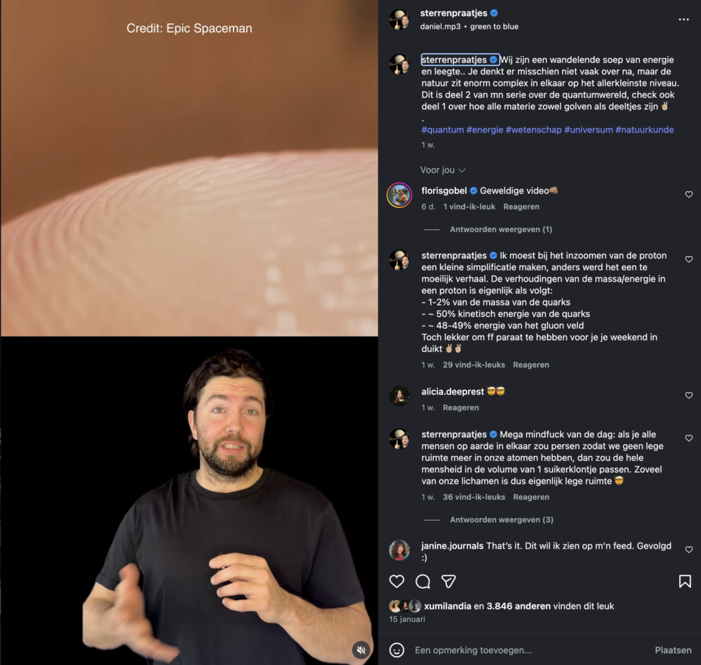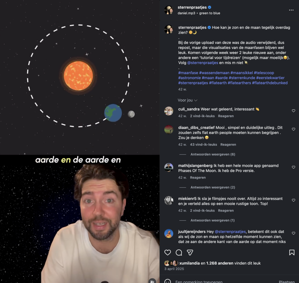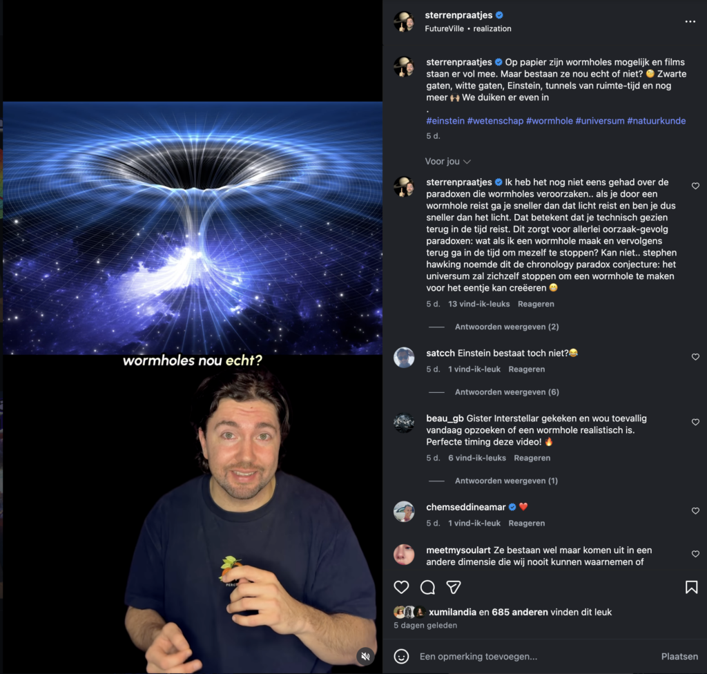 In 2024 richtte Liam het socialmediakanaal Sterrenpraatjes op. Met korte en toegankelijke filmpjes over zwarte gaten, planeten en de levensloop van sterren, bereikt hij inmiddels dagelijks tienduizenden volgers en weet hij een breed publiek te inspireren om meer omhoog te kijken. Hieronder staan een paar voorbeelden van zijn filmpjes.